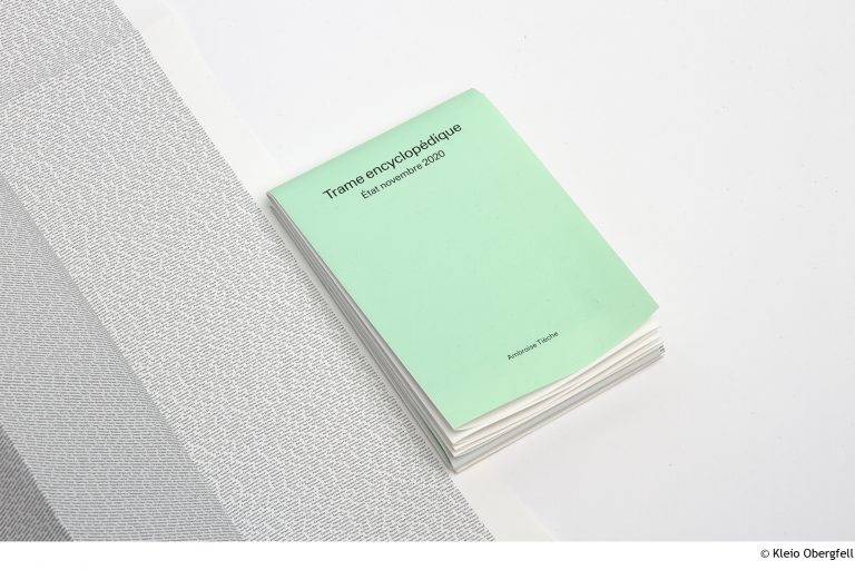 Trame encyclopédique, 2021 Offset et sérigraphie sur Polyart 90g. Édition de 50 numérotée, signée. Dim. déployée : 96 x 67cm ; Pliée : 16,75 x 12 x 1,9cm. Prix : 160 CHF / 145 € + frais postaux selon destination. L’édition réunit toutes les entrées du lexique du DEL, état novembre 2020.